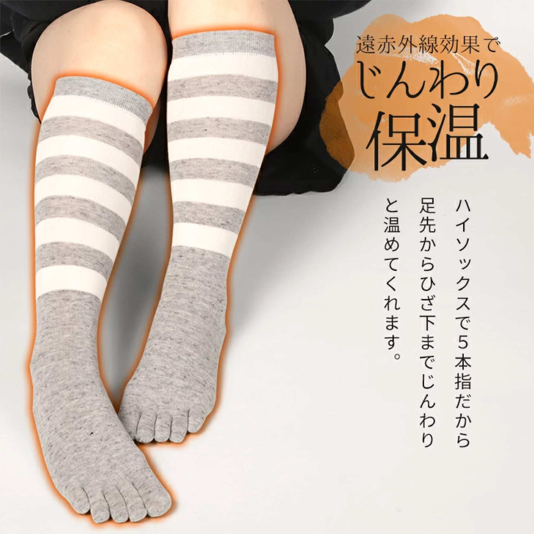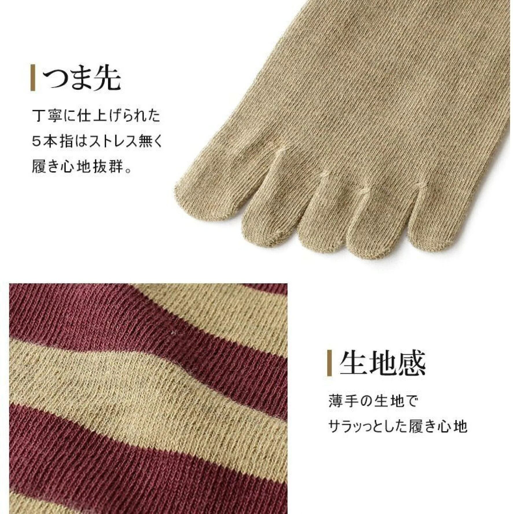 良質な超長綿を高温で燃焼させて出来た炭の糸を編み込んだ五本指ボーダー柄のソックス。