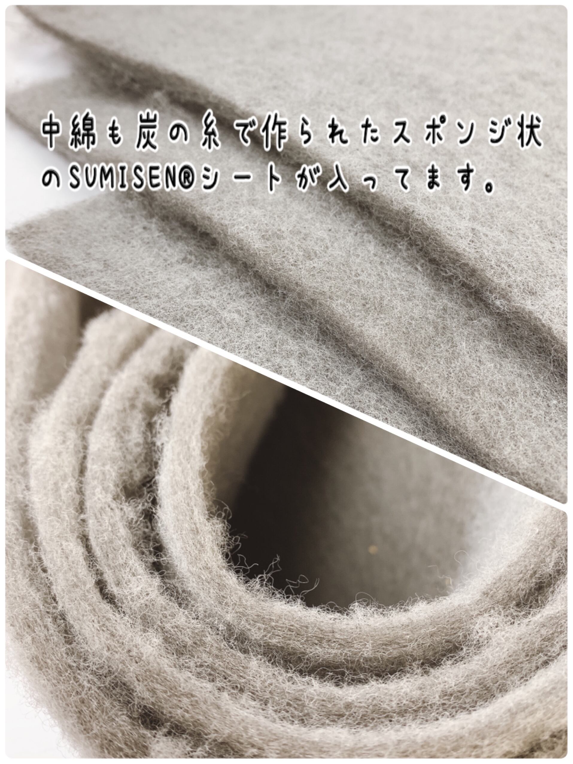 2:表面デニム生地、裏面生地、中綿(スポンジ風の炭ワタシート)全て炭の糸が入っています。