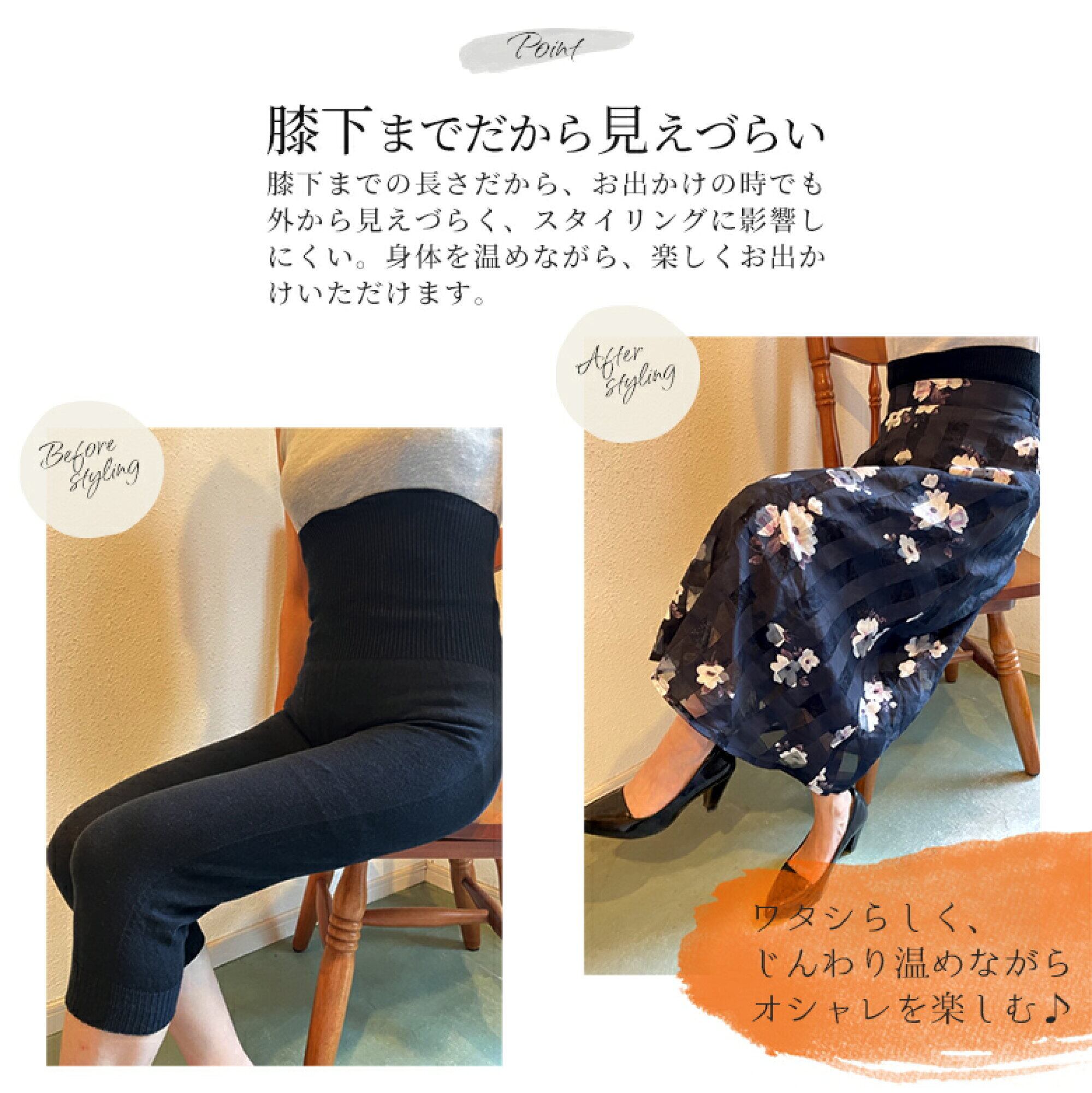 膝下までの長さがあり、スカートを履いても見えにくいので、お家ではもちろん、外出時にも使えて体温を保持し温かさを逃がしません。