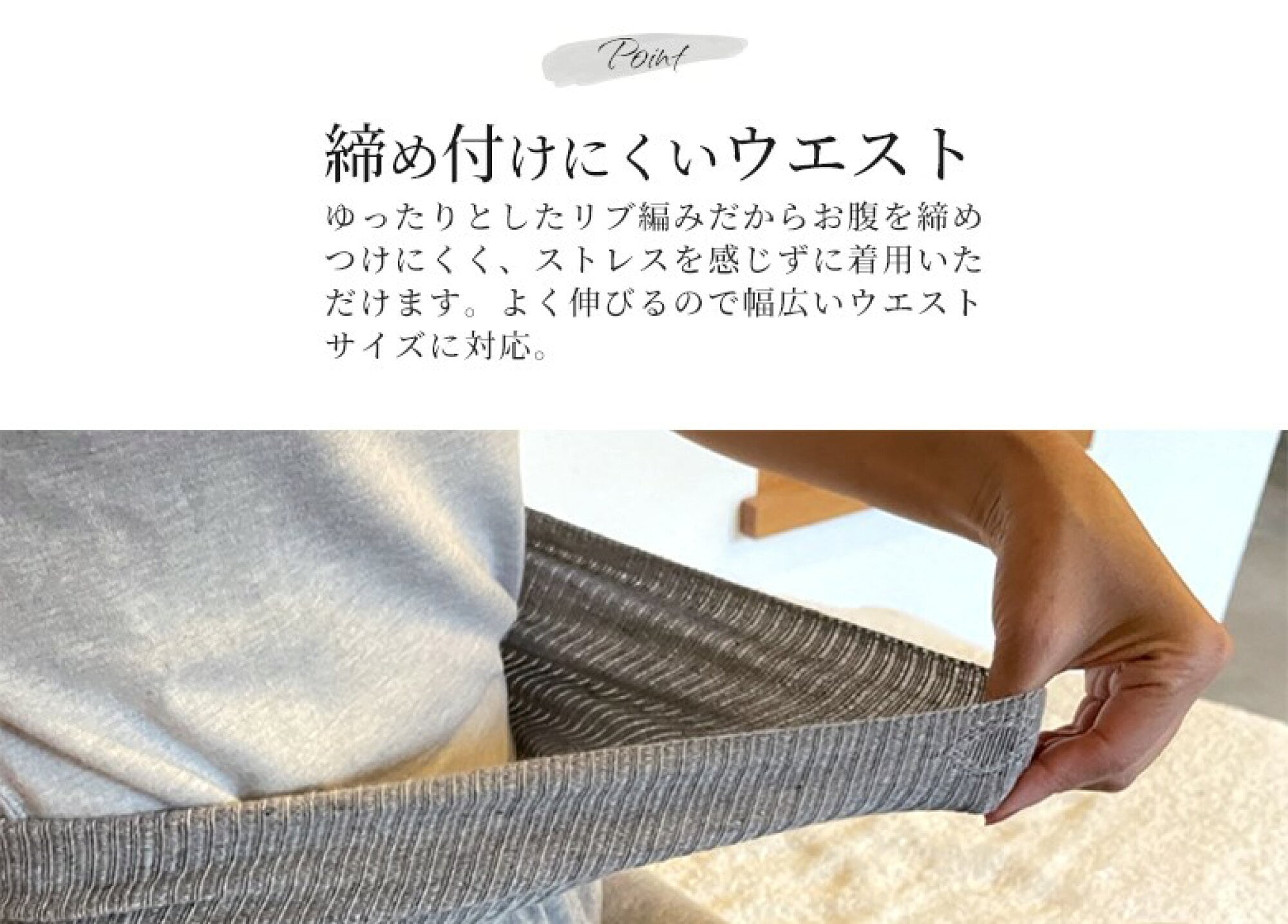 お腹はリブ編みでしっかりと伸び縮みしてくれるので、ゆったりとリラックスした状態をキープ。