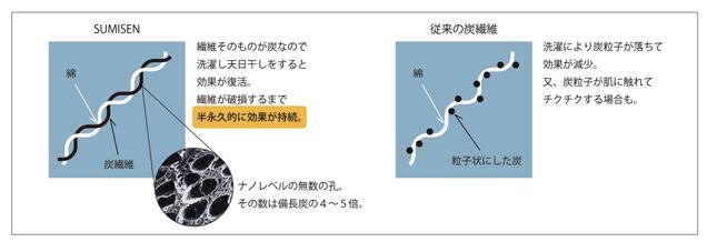 従来の製品の特徴である「薬品の塗布」や「練りこみ」により炭の効果が得られる素材ではないので、お洗濯を繰り返しても炭の効果が落ちません。