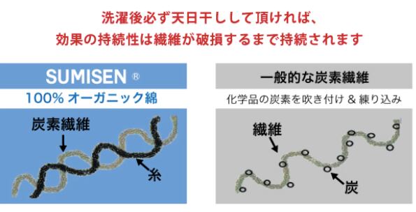 従来の製品の特徴である「薬品の塗布」や「練りこみ」により炭の効果が得られる素材ではないので、お洗濯を繰り返しても炭の効果が落ちません。